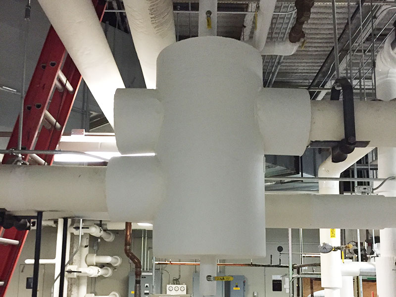 A more complex fiberglass pipe insulation system that includes an all-service jacketing and premolded PVC fittings containing fiberglass inserts.